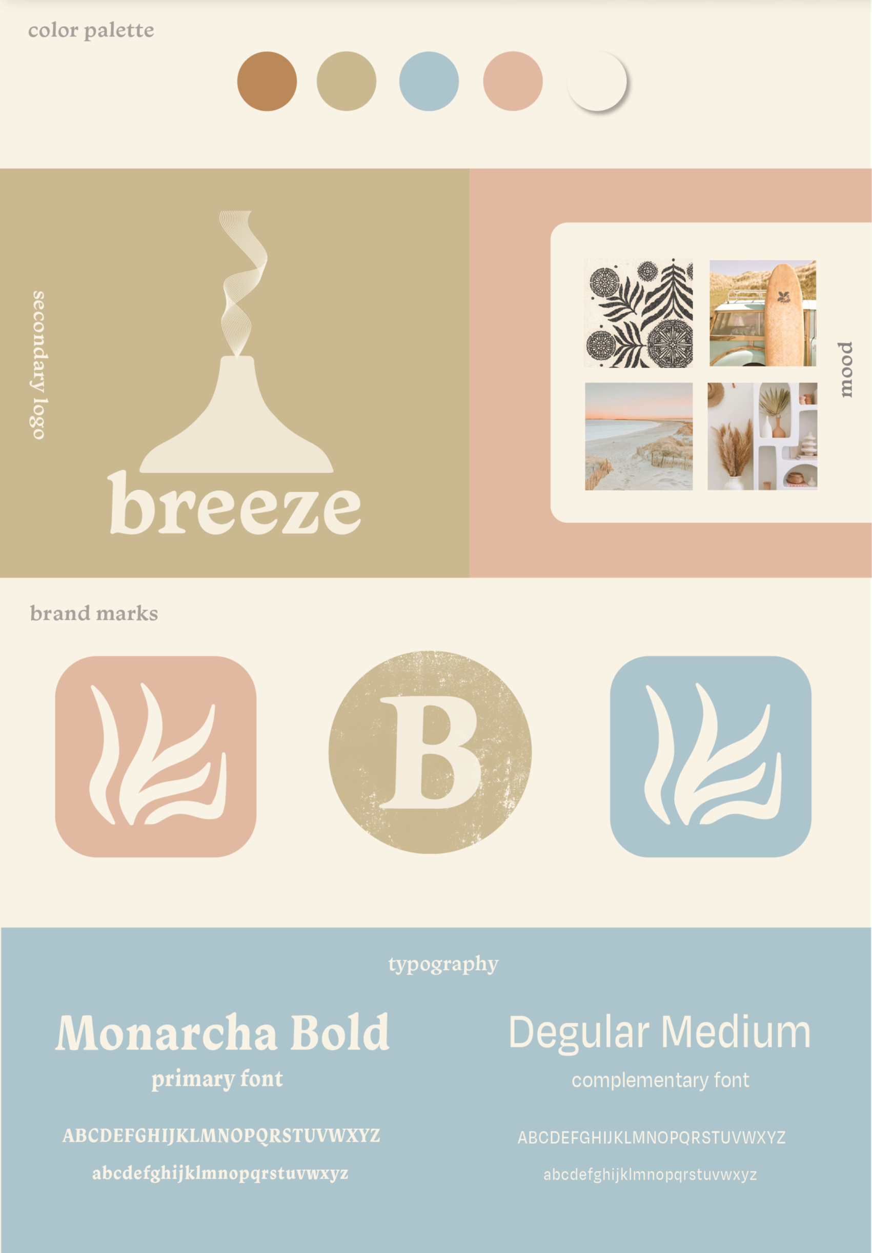 Conceptual brand identity for Breeze, an aromatherapy brand inspired by flow and natural stillness. This self-initiated project includes a logo design, an earth toned color palette and typography exploration.